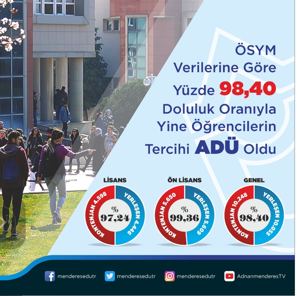 Türkiye’nin ve Ege Bölgesi’nin en seçkin üniversitelerinden biri olarak başarı grafiğini günden güne yükselten Aydın Adnan Menderes Üniversitesi yüzde 98.40 yerleşme oranı ile öğrencilerin tercihi olurken; ön lisans yerleşme oranı yüzde 99.36, lisans yerleşme oranı ise yüzde 97.24 oldu.