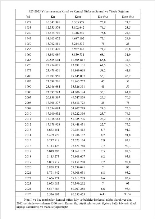 Adrese Dayalı Nüfus Kayıt Sistemi Sonuçları, 2025 verilerine göre, Türkiye nüfusunun %93’ünden fazlası şehirlerde yaşarken, kırsal (belde/köy) kesimde bu oran %6,43’e kadar gerilemiş durumdadır.