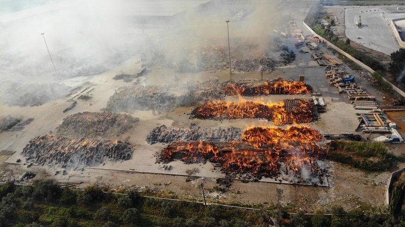 Dün akşam saatlerinde Aydın’ın Söke ilçesine bağlı Sazlı Mahallesi yakınlarında bulunan Söke Kipaş Kağıt Fabrikası’nda başlayan yangın gece saatlerinde kontrol altına alınmıştı. Gece yarısı rüzgarın şiddetini arttırası ile yeniden kontrolden çıkan yangına tüm bölgeyi sardı. Onlarca dönüm kağıt atık depolama alanında istiflenmiş tüm kağıt blokların tutuşması sonucu binlerce ton atık kağıt alev alev yandı. Karadan müdahalenin gece boyunca devam ettiği yangına sabah havanın aydınlanması ile birlikte hava araçları da yeniden müdahale etti.